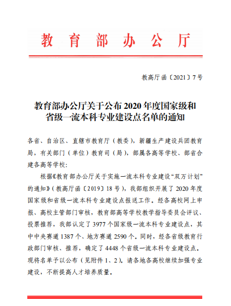 近日,教育部办公厅印发《关于公布2020年度国家级和省级一流本科专业建设点名单的通知》(教高厅函〔2021〕7号),中文av