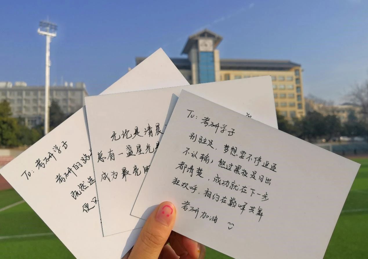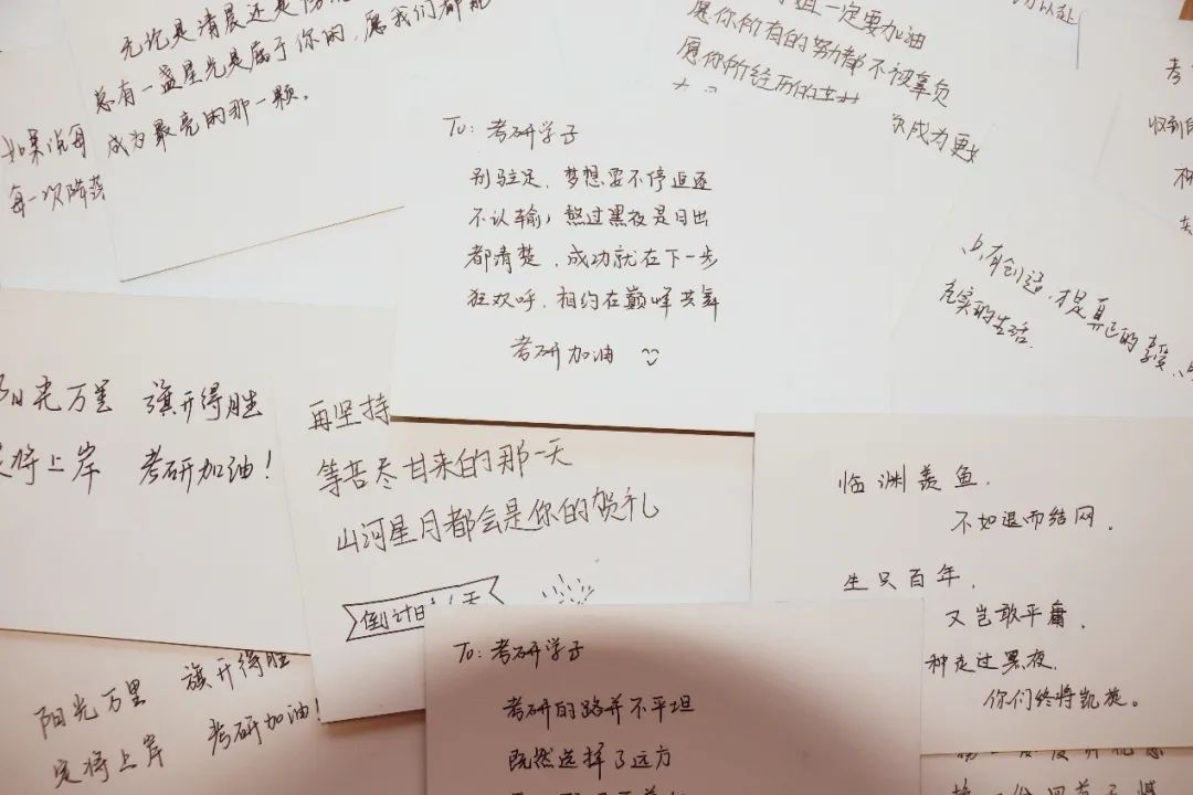 学院老师和学弟学妹们写下祝福满满的明信片,为考研学子送上祝福。愿同学们旗开得胜,成功上岸。