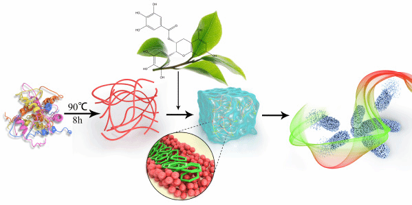 该研究工作立足于食品品质和食品安全,通过加工诱导食品球蛋白自组装形成淀粉样纤维。首次发现了小分子食物多酚能够通过疏水作用、π-π共轭相互作用、氢键作用驱动蛋白质淀粉样纤维的自组装,形成复合超分子水凝胶。这种完全食品级的多酚-蛋白质纤维复合超分子水凝胶具有广谱的抗菌功能,其抗菌机制在于诱导微生物凝聚,从而破坏细胞膜结构。该研究实现了在无盐、无防腐剂、无抗菌剂条件下,通过食品组分相互作用,保障食品安全。