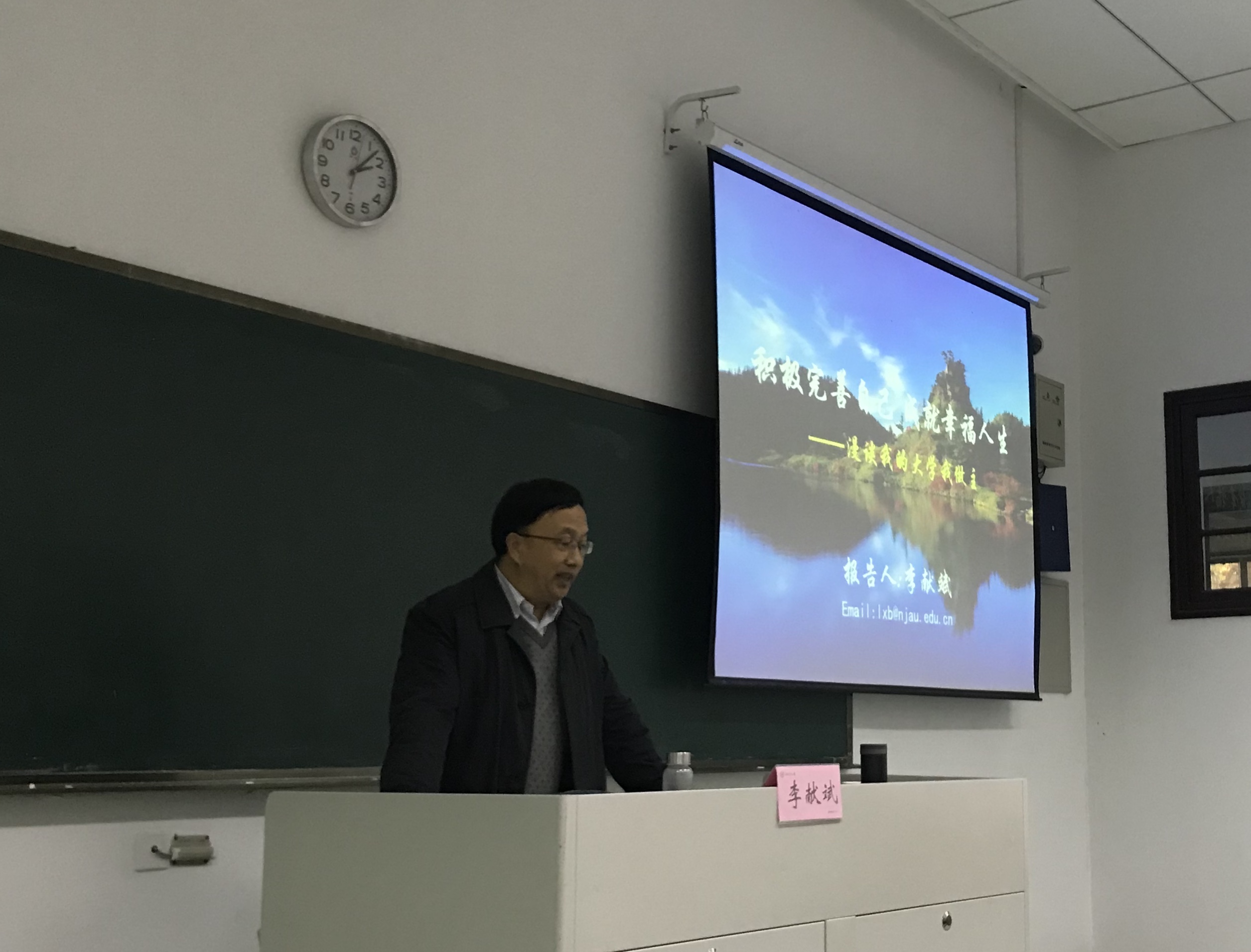 新生心理公开课活动在主楼134举行,学工处副处长李献斌副教授应邀做“积极完善自己,成就幸福人生”主题报告。食品科技学院近200名学生参加了本次活动。