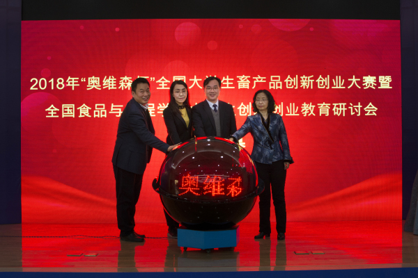 开幕式上,与会领导共同启动2018年“奥维森杯”全国大学生畜产品创新创业大赛暨全国食品科学与工程学科大学生创新创业教育研讨会水晶球。