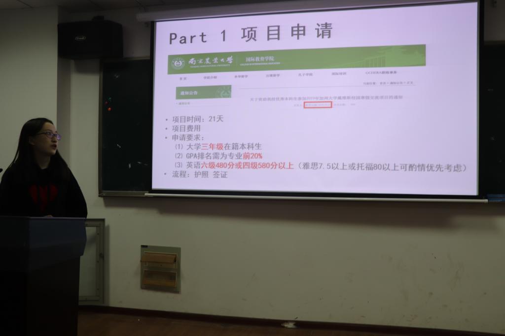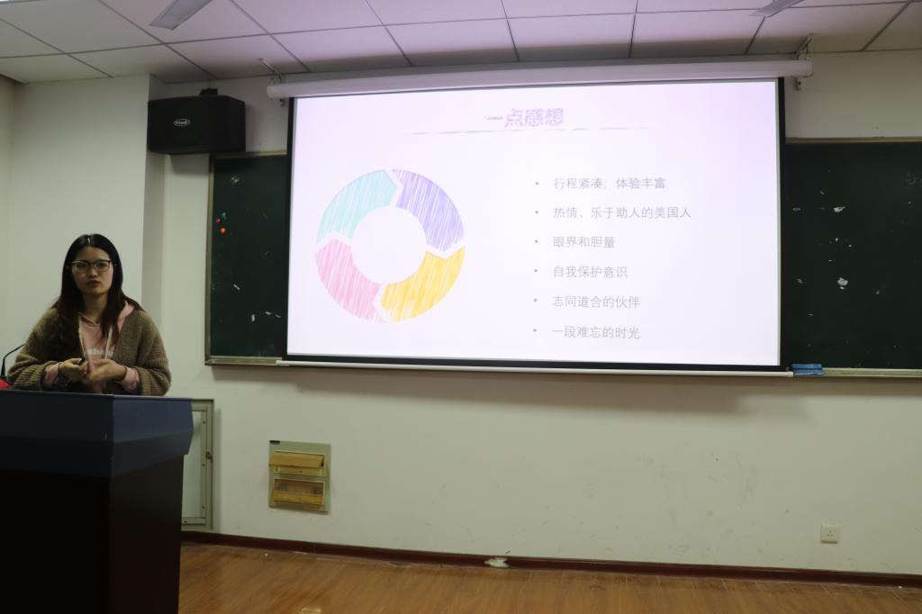 罗承栋首先对访学项目进行了介绍。对项目情况、报名要求进行了详细介绍。随后是优秀学生代表分享环节。周佳滢、黄凯寅、阮圣玥、吕芳鑫、陈熙林分别从项目申请要求、访学行程安排、课程学习情况、课外生活体验以及翻译实习工作体验等方面,与同学们分享了参与访学项目和实习过程中收获的经验和感受。
