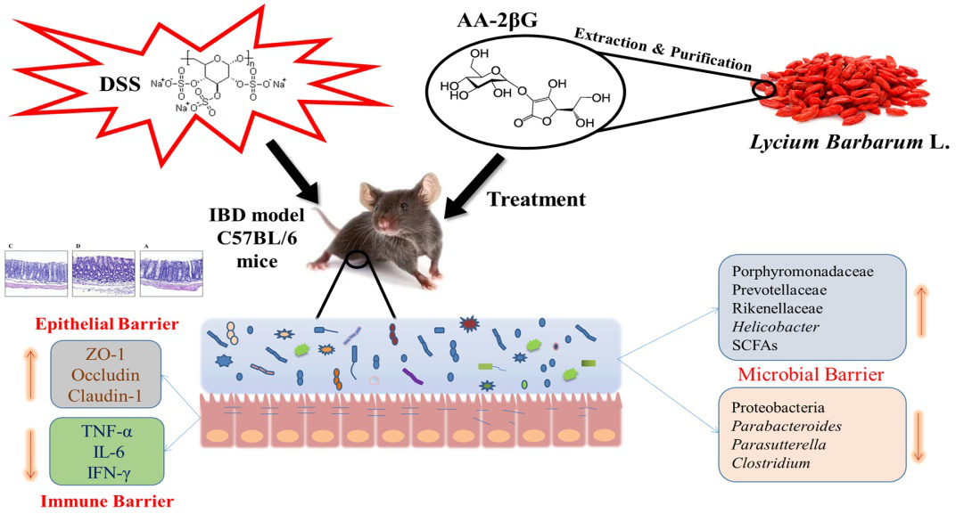该研究表明红果枸杞中一种抗坏血酸衍生物2-O-β-D-葡萄糖基-L-抗坏血酸(AA-2βG)对葡聚糖硫酸钠(DSS)诱导的结肠炎小鼠有抗炎症活性,并对肠道菌群有一定的调节作用。该研究成果获得了匿名审稿专家的肯定,为AA-2βG的抗炎症活性提供了新的支持,同时为枸杞中活性成分AA-2βG的开发提供了科学理论依据。该研究得到了中文av
