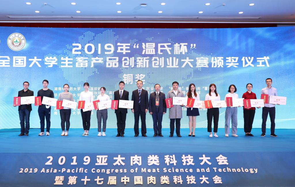 10月12日上午,“温氏杯”全国大学生畜产品创新创业大赛决赛颁奖典礼在南京国际会议中心举办的亚太肉类科技大会上举行。农业农村部畜牧兽医局副局长王俊勋、中国畜产品加工研究会会长周光宏教授、温氏股份养禽事业部副总裁秦开田、荷兰马斯特里赫特大学教授Mark Post、中国畜产品加工研究会名誉副会长李洪军教授、农业农村部屠宰技术中心副处长高胜普、中国畜产品加工研究会副会长、杭州艾博科技工程有限公司董事长韩青荣和平遥牛肉集团董事长雷秉义等人应邀出席本次颁奖典礼并为获奖者颁奖。颁奖典礼由中文av