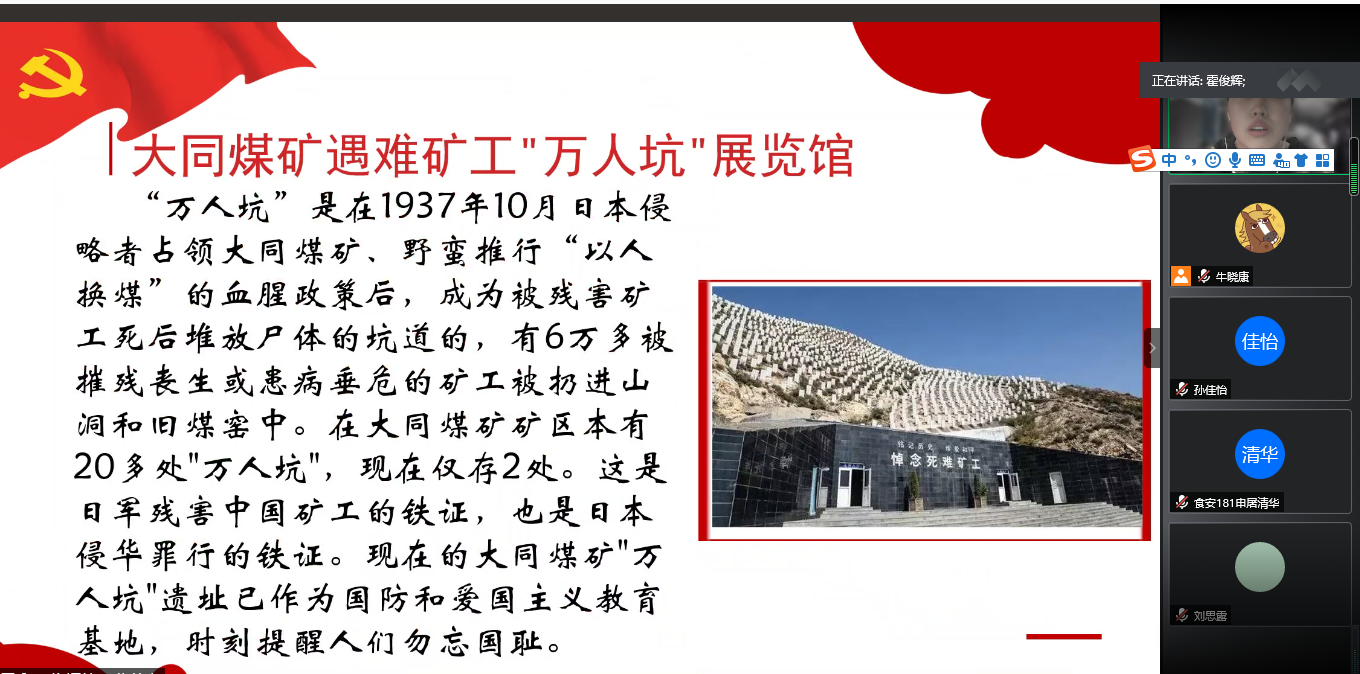 其中,本科生霍俊辉同学的《抚今追昔,看“峥嵘”山西》主题演讲讲述了山西省的6个系列爱国主义红色教育基地,并对大同煤矿遇难矿工"万人坑"展览馆、徐向前故居和纪念馆以及刘胡兰纪念馆进行了重点介绍,用生动的语言致敬先烈,赞颂了革命先辈艰苦卓绝、追求真理、坚定信仰的革命精神。