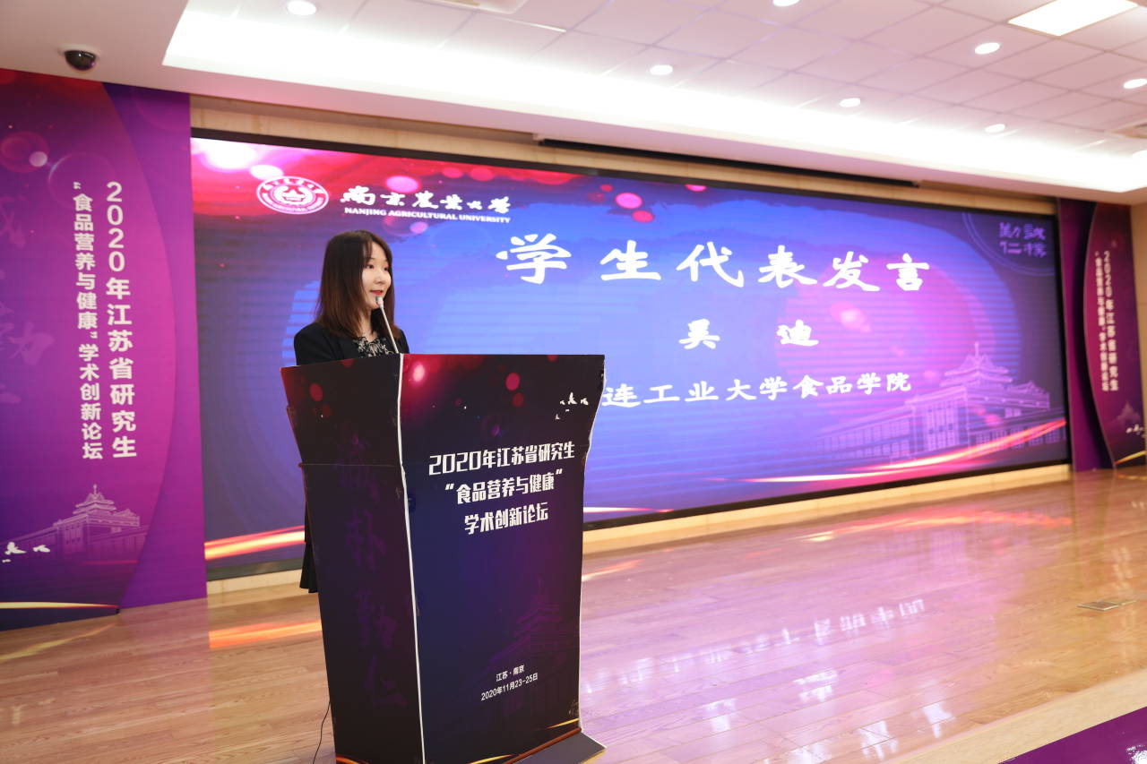 参会学生钱婧、大连工业大学参会学生吴迪作为学生代表依次发言。她们代表全体参会研究生,将在此次论坛中交流学习、开拓眼界、提升自我、共同进步,不忘对于食品的责任、热忱和情怀,不负韶华,拥抱梦想。