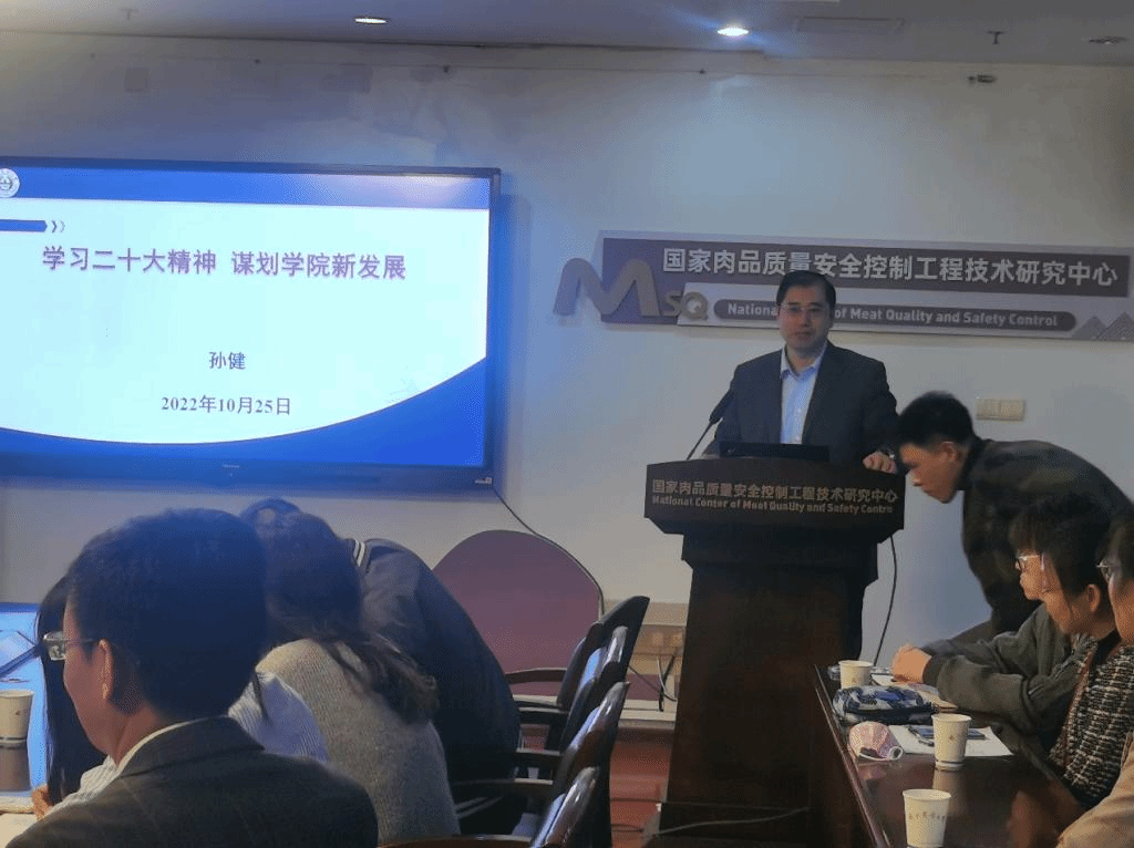 10月16日——22日,中国共产党第二十次全国代表大会在北京胜利召开。中国共产党第二十次全国代表大会的主题是:高举中国特色社会主义伟大旗帜,全面贯彻新时代中国特色社会主义思想,弘扬伟大建党精神,自信自强、守正创新,踔厉奋发、勇毅前行,为全面建设社会主义现代化国家、全面推进中华民族伟大复兴而团结奋斗。食品学院党委书记孙健结合党的二十大报告精神学习,于10月26日——27日,在肉品中心会议室及学院220会议室分别给学院四个教师党支部党员做“学习党的党的二十大报告,谋划学院新发展”的微党课。