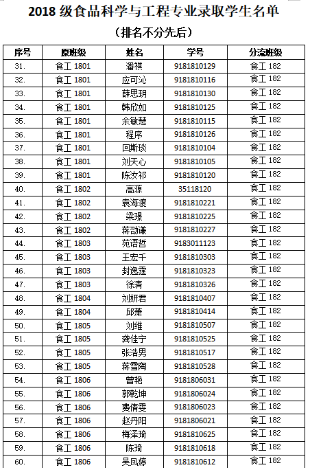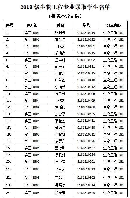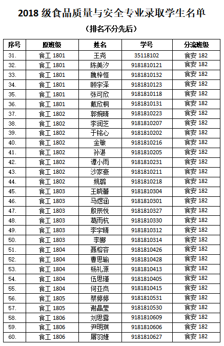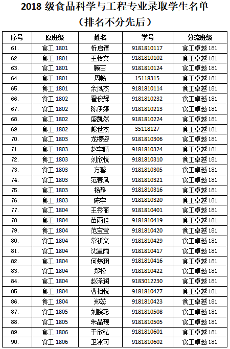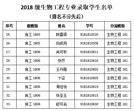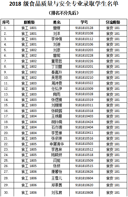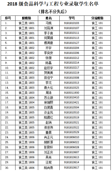 依据《中文av 2018级本科大类招生专业分流实施方案》和《中文av 2018级本科大类招生专业分流工作计划》,学院开展了2018级食品科学与工程大类专业分流工作,各专业录取人数如下:食品科学与工程专业录取90人、生物工程专业录取33人、食品质量与安全专业录取60人,现将录取学生名单予以公示,详细名单见附件。