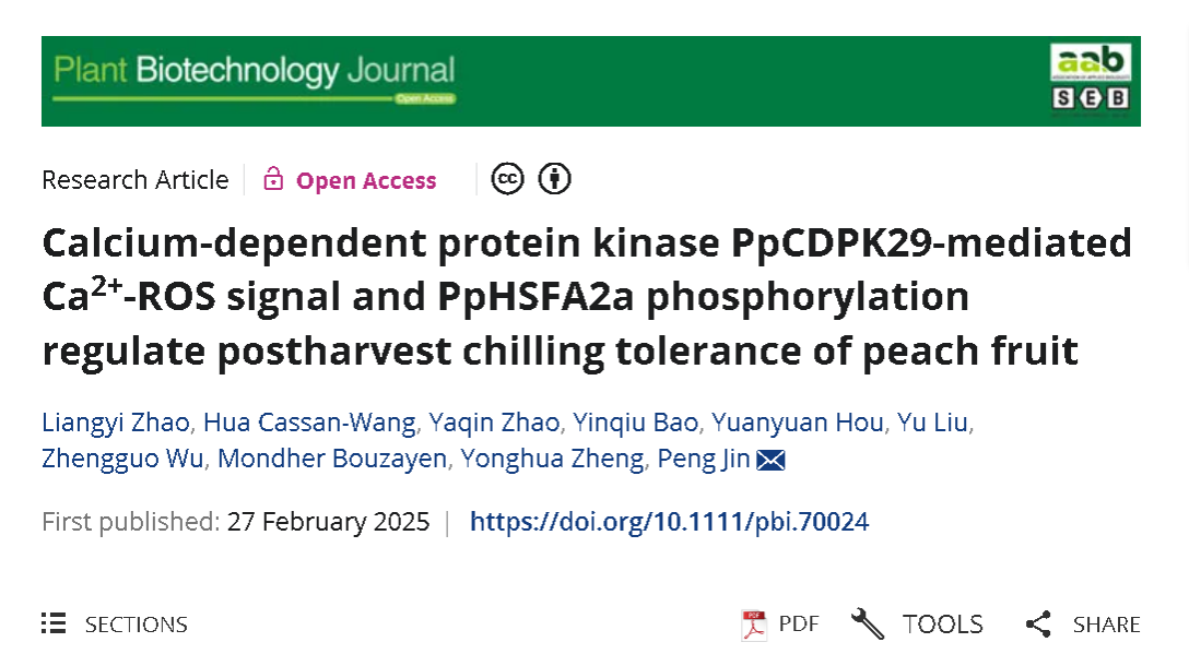郑永华教授和金鹏教授课题组题为“Calcium-dependent protein kinase PpCDPK29-mediated Ca2+-ROS signal and PpHSFA2a phosphorylation regulate postharvest chilling tolerance of peach fruit”的研究论文,该研究揭示了钙依赖蛋白激酶PpCDPK29通过Ca2+-ROS信号通路以及对PpHSFA2a磷酸化作用调控桃果实采后冷害的分子机制。